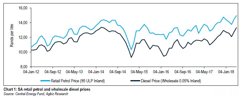 After a notable increase in fuel prices earlier this month, June 2018 could bring further uptick in fuel prices to an all-time high. This is due to higher Brent crude oil price, coupled with the relatively weaker Rand against the US Dollar. It is still early to be certain about the scale, but the current estimates suggest that prices of petrol and diesel could rise by roughly 5% and 6%, respectively, from May 2018 levels. From an agricultural perspective, this will add pressure on farmers and agribusinesses as it coincides with a high fuel consumption period — harvesting period for summer crops and a planting period for winter crops. It is worth noting that 81% of maize, 76% of wheat and 69% of soybeans in South Africa are transported by road. On average, 75% of national grain and oilseed are transported by road.