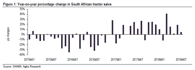 At this time of the year, the tractor sales are typically supported by large purchases by grain farmers, but this time around there were also buyers from the horticulture industry, as well as a couple of government tenders. Moreover, the current competitive pricing in the market, as new players continue to enter the South African agricultural machinery industry, also boosted the tractor sales. Drawing from the historical data, August 2018 tractor sales could potentially increase to roughly 560 units as the new summer crop season approaches.
