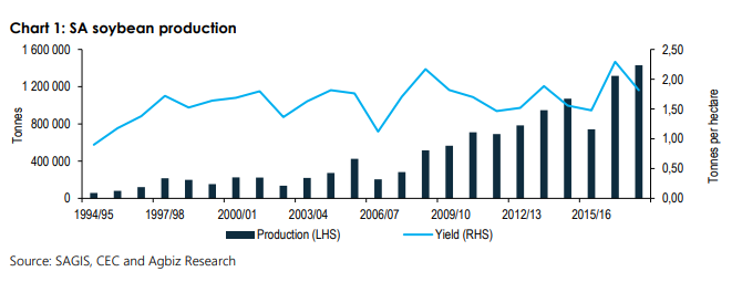 There has been an increase in demand for locally produced soybean to meet increasing animal feed demand, which in turn has been stimulated by increases in the demand for high protein food, particularly poultry products. South Africa’s per capita consumption of poultry meat almost doubled over the past 17-years, currently estimated at 41 kilograms, according to data from Department of Agriculture, Forestry and Fisheries.