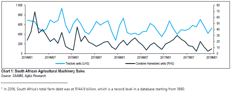 The uptick in January 2018 tractor sales came as a surprise because, given that the National Crop Estimates Committee placed its preliminary area planting estimates for South Africa’s 2017/18 summer crops at 3.70 million hectares, down by 7% y/y. White maize, sunflower seed, groundnuts and sorghum plantings are the key reason for this overall downswing owing to dry and warm weather conditions experienced in the western parts of South Africa in the end of 2017 and the start of 2018.