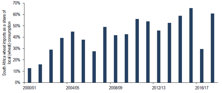 Chart: South Africa’s wheat imports as a share of local (wheat) consumption